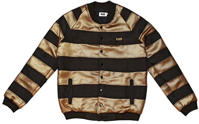 Free Worldwide Delivery from Poland. This unisex bomber jacket features black and gold stripes with a black snap fastener. The bomber jacket has a cotton lining with internal zippered pocket. The sleeves and neckline are finished with ribbing.